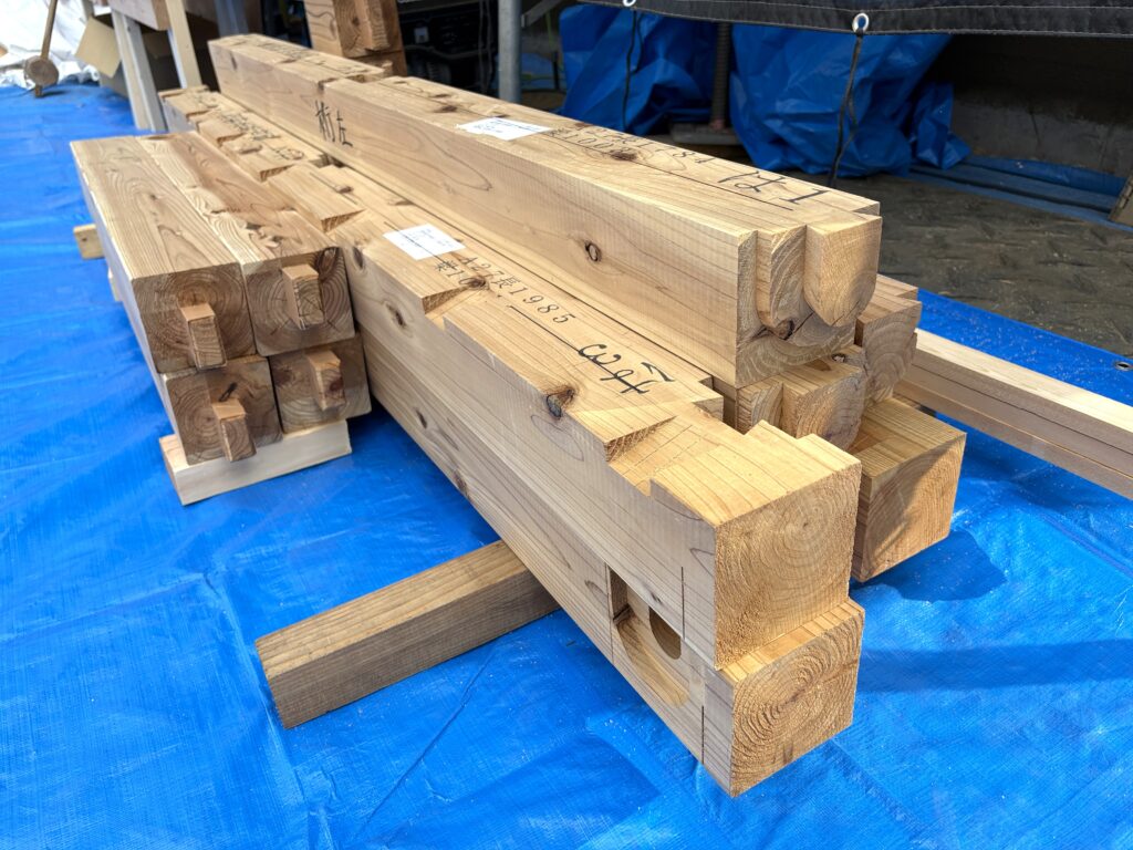 子ども達にも上棟体験をしてもらいたいと、この日のためにプレカットされたミニサイズの上棟セットをオーダーしました。部材に「いろはに…」の通し番号も書かれ、本格的な仕様です!