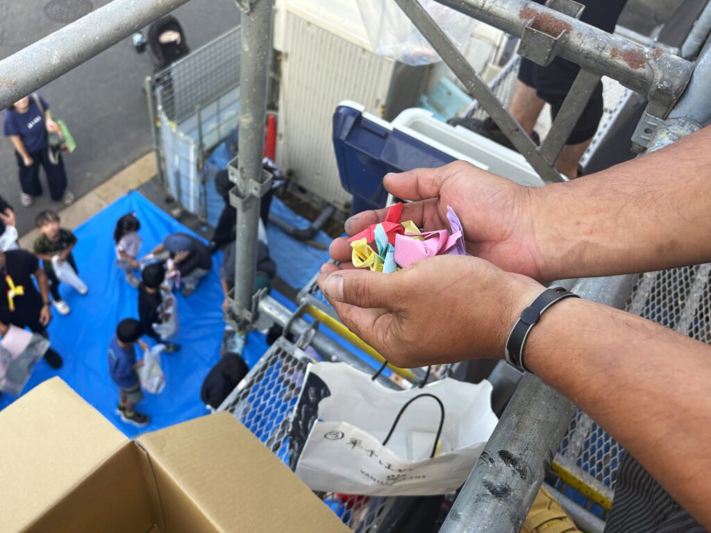 空から降ってくるお菓子やお餅に大喜びの子ども達!早速、おひねりを開いたり、袋いっぱいのお菓子を見せ合ったり、とても楽しい時間を過ごしてもらえたようで何よりです。