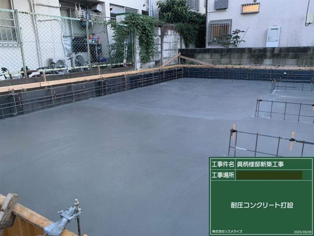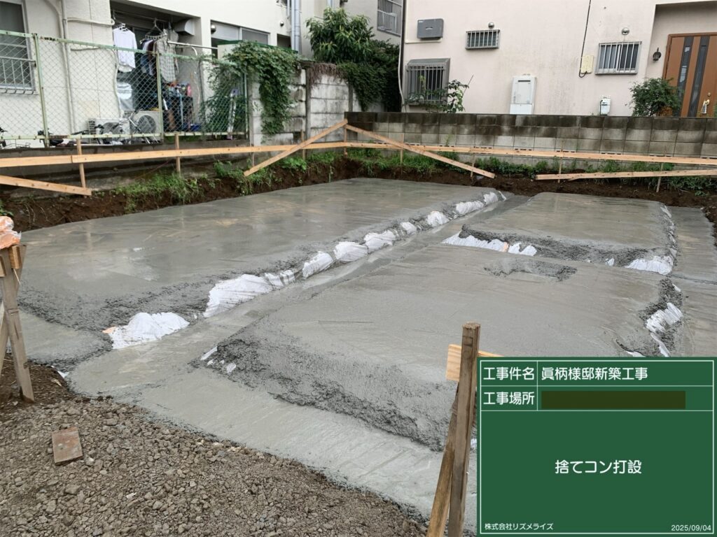 • 捨てコン: 基礎の位置を正確に記す(墨出し)ために、薄くコンクリートを流します。「捨て」といっても、精度を出すための大事なステップです。