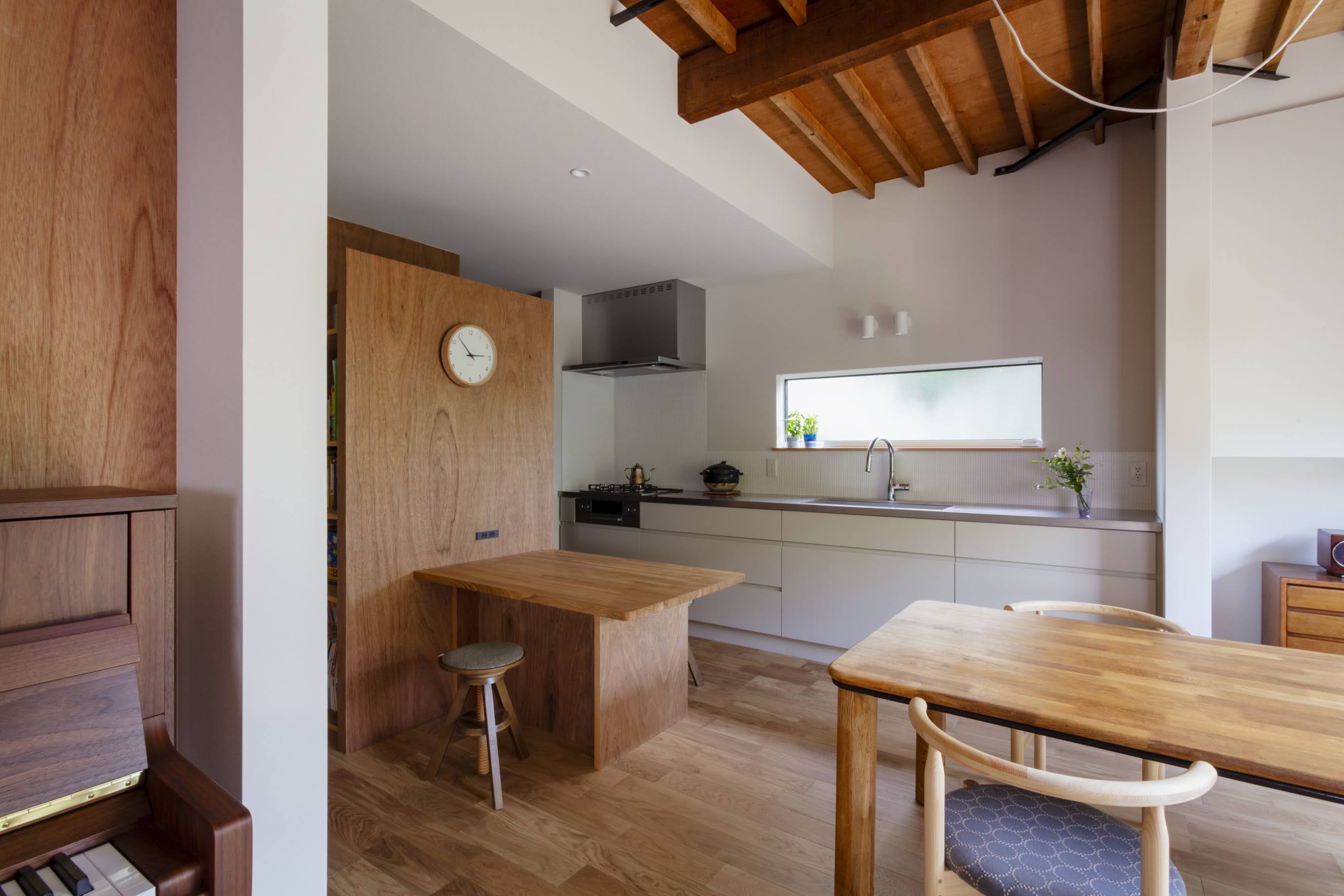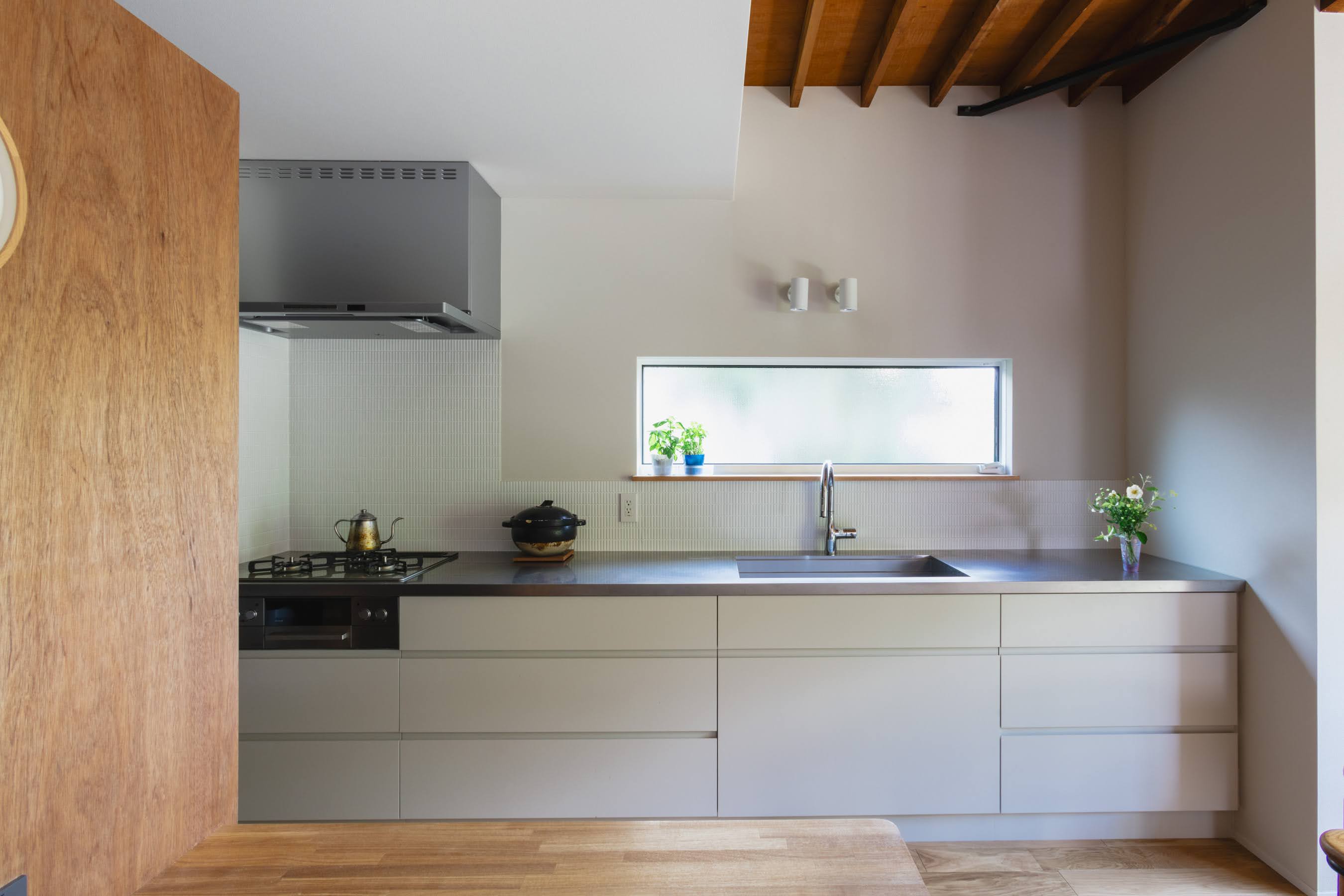 • キッチン前には造作壁と同じ色調の作業台も設え、より使い勝手の良いキッチンに。