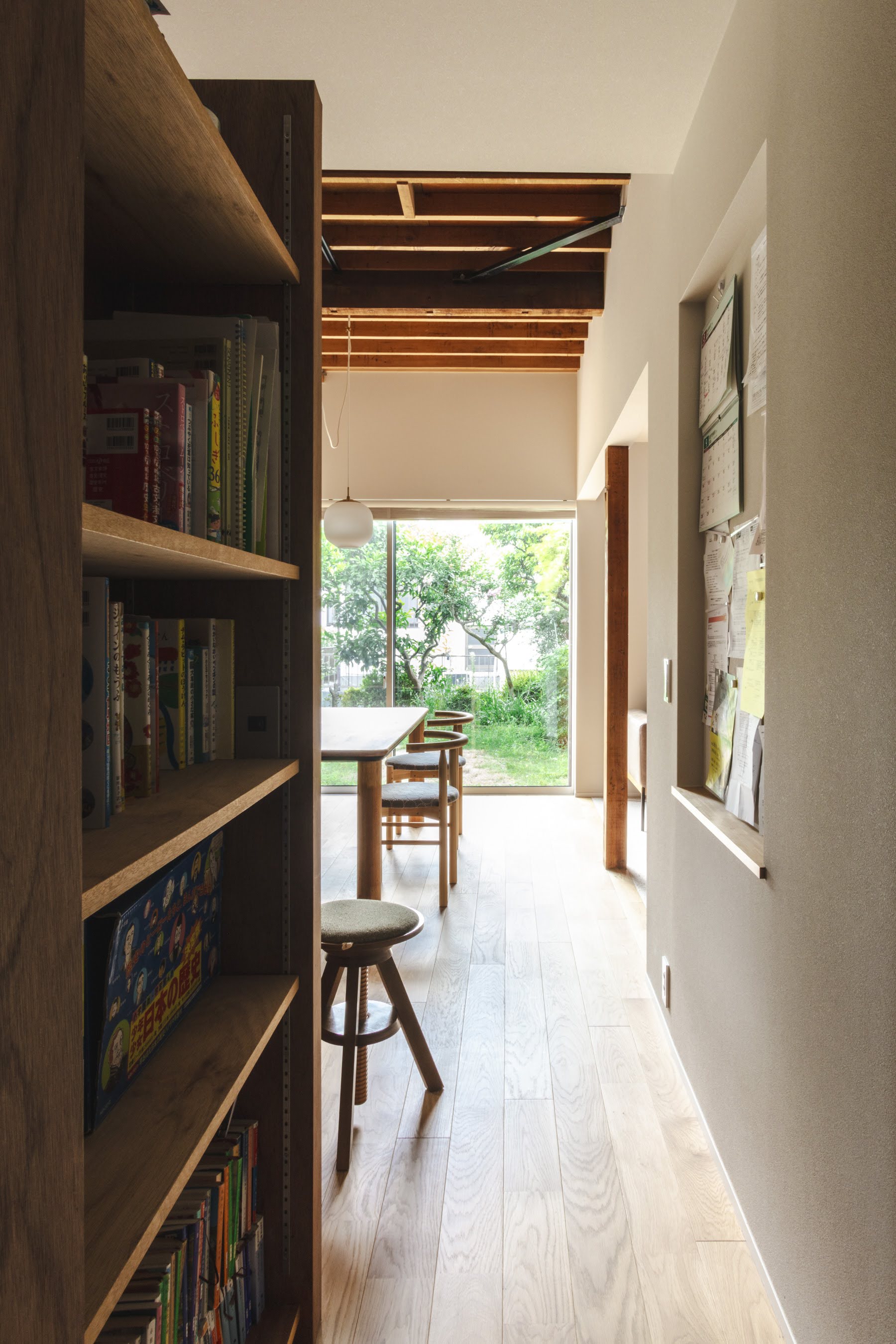 • 廊下には造作で設えた本棚と、壁面のディスプレイコーナーも。高さを抑えた細長い廊下からダイニングへと、シークエンスの変化も楽しめます。