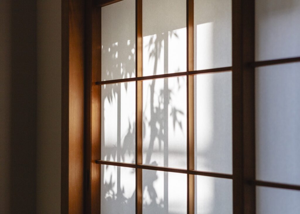 • 障子は既存の枠のコンディションも良く、紙の張替のみを行いました。外の植物の印影を美しく映し出します。