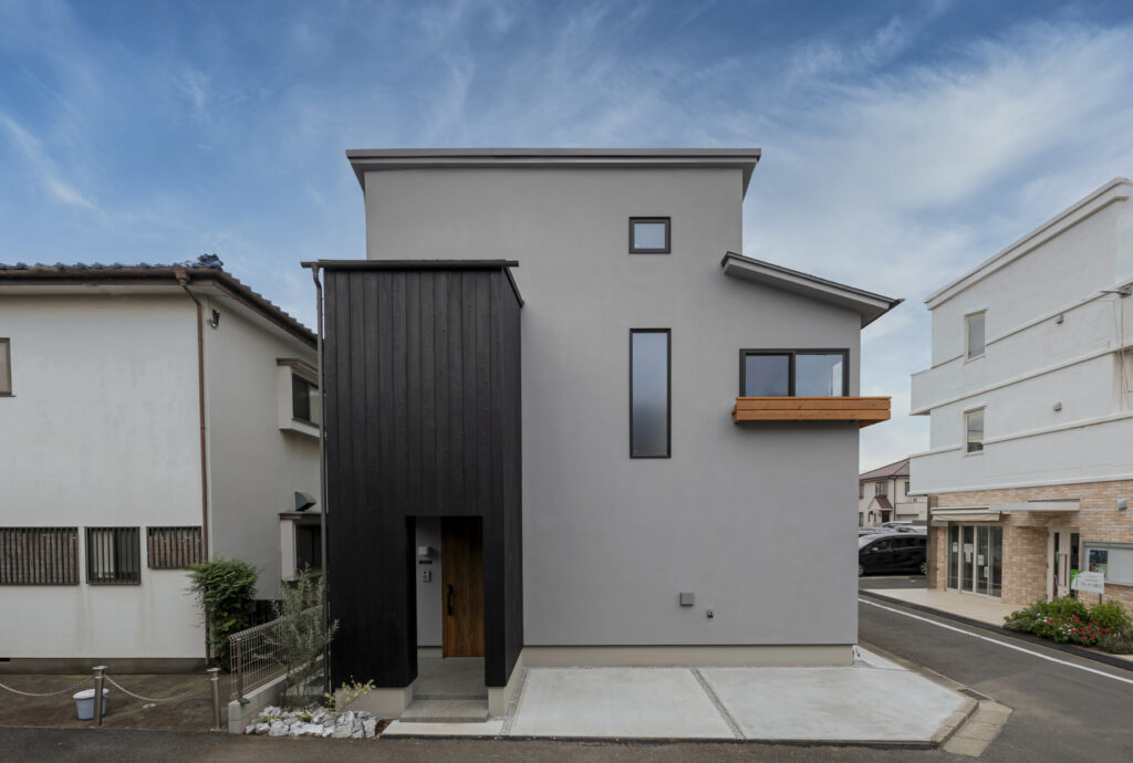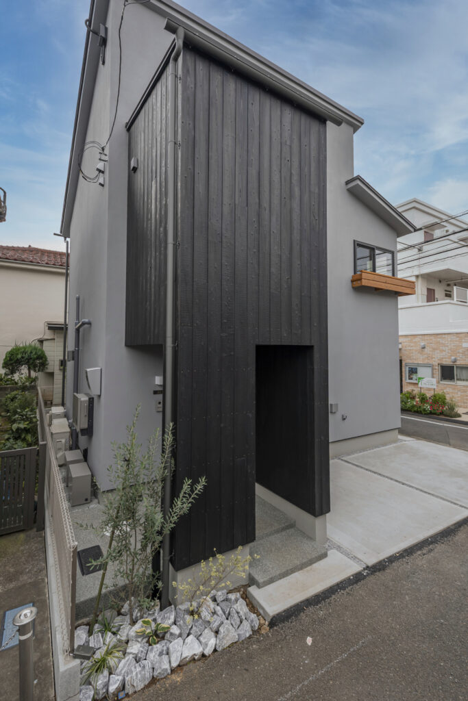キューブの様な玄関ポーチは二階部分にぴったりと浴室が収められており、スペースを上手く活用されたプランニングです。