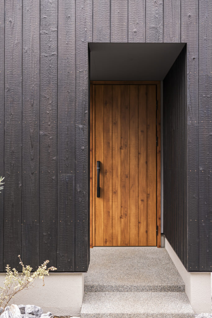 奥行きが感じられる玄関ポーチ。素材感のある焼杉に玄関ドアが良く映えます。
