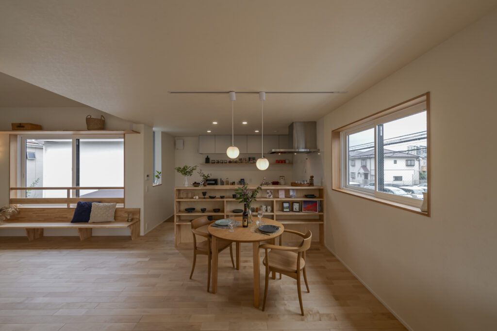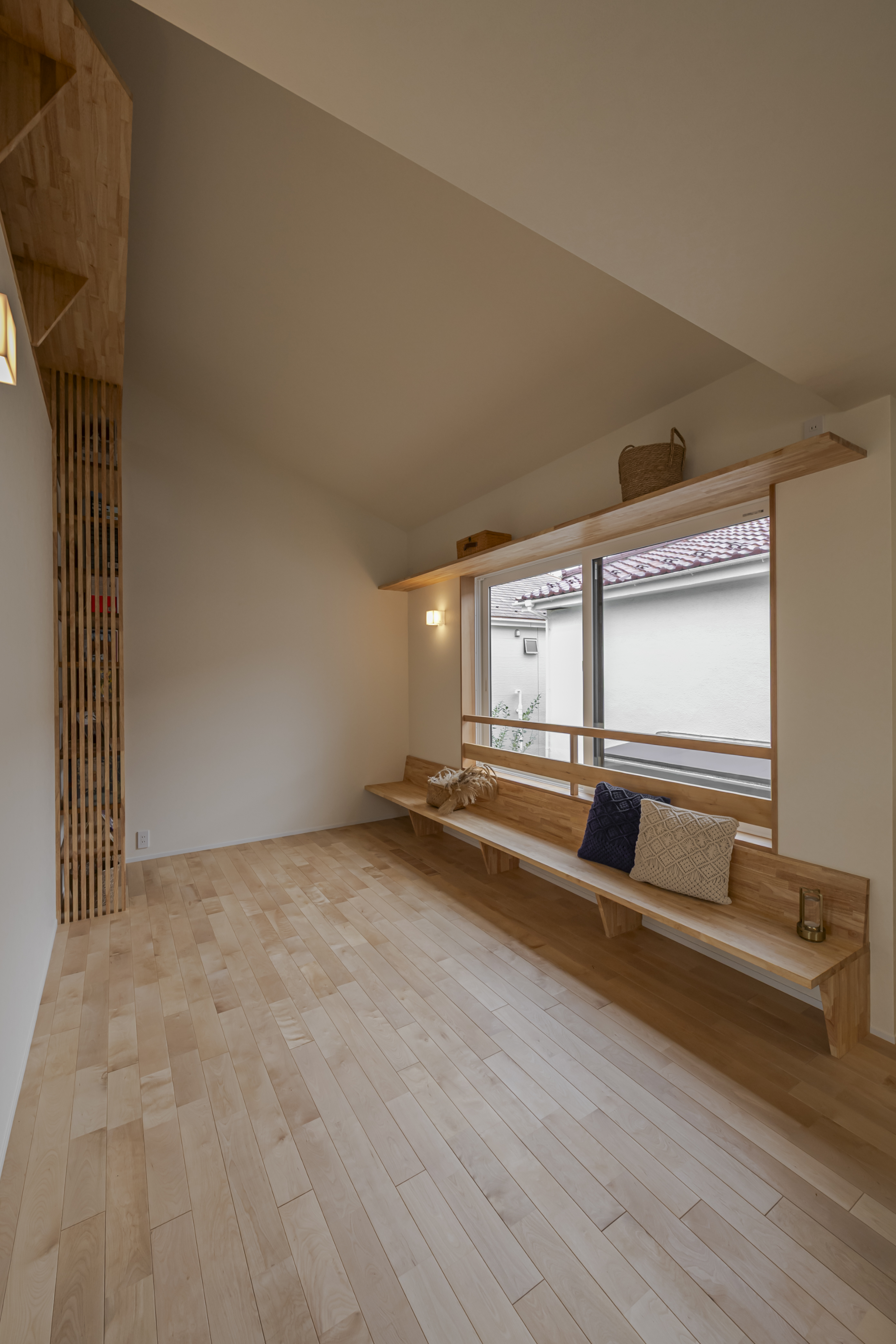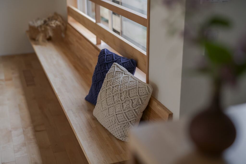 リビングの主役は大きな窓に面して設えた木製のベンチ。窓の上を活用した棚板、座面が軽やかなデザインのベンチは落下防止を兼ねた背もたれ付きです。ご家族全員が座れるゆったりとした寛ぎの場所です。