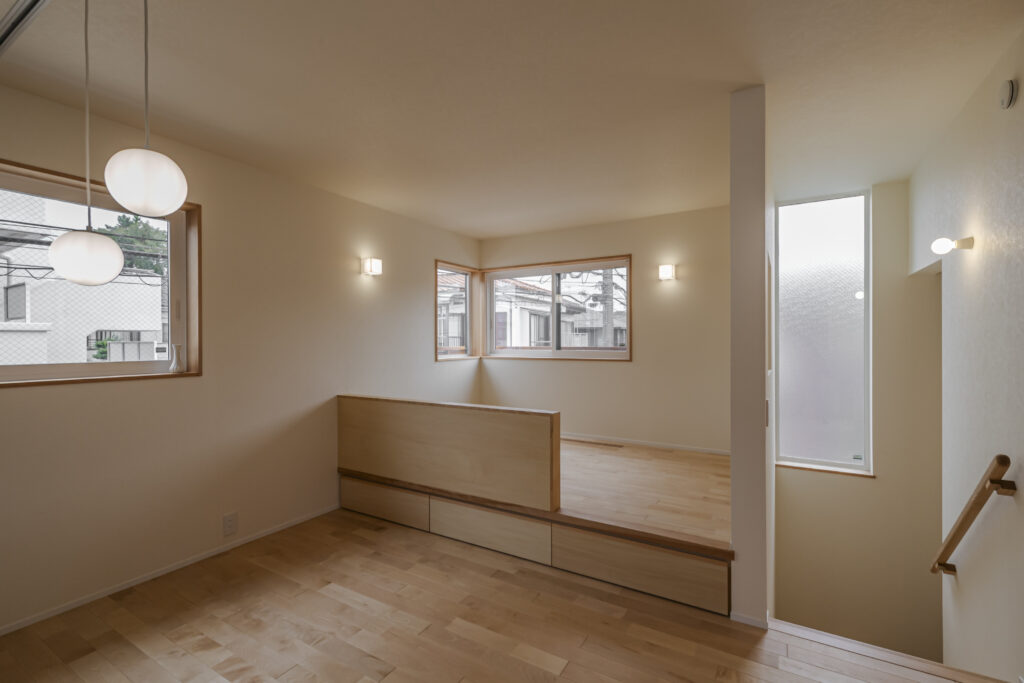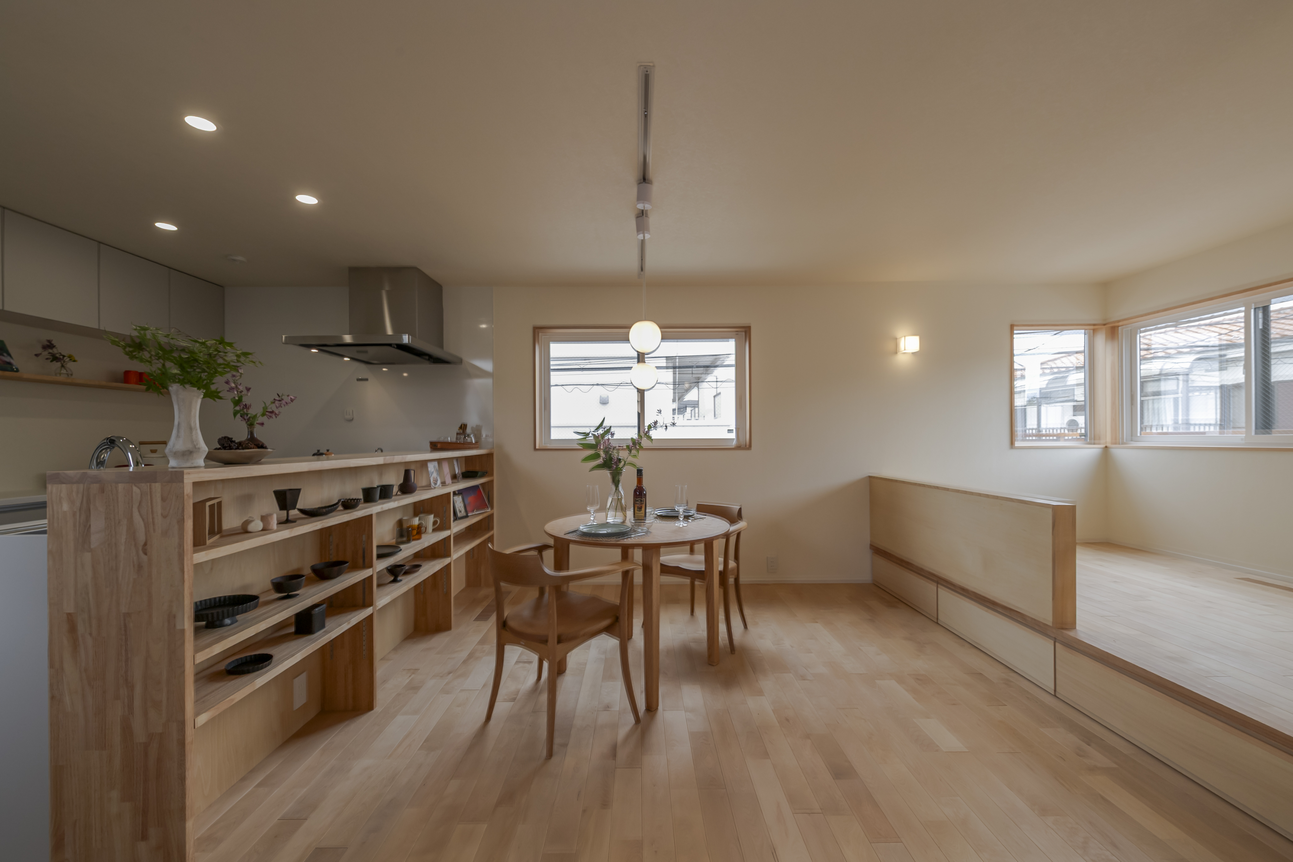 ダイニングに面した小上がりスペース。低めの壁で一体感を持たせながら柔らかく空間を仕切ります。