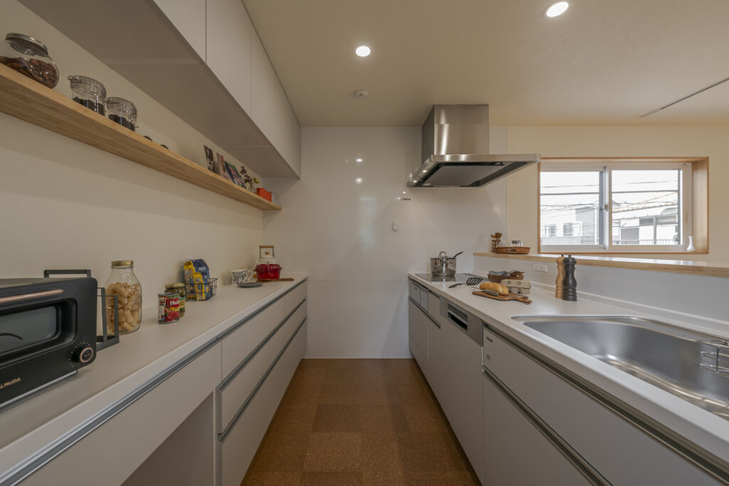 幅2600mmのシステムキッチンは明るいトーンのグレーの面材が床のコルクの色味にも似合います。背面にキチンボードと吊戸棚を設け、収納力もたっぷです。造作で取り付けた飾り棚もアクセントに。