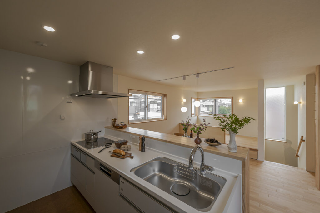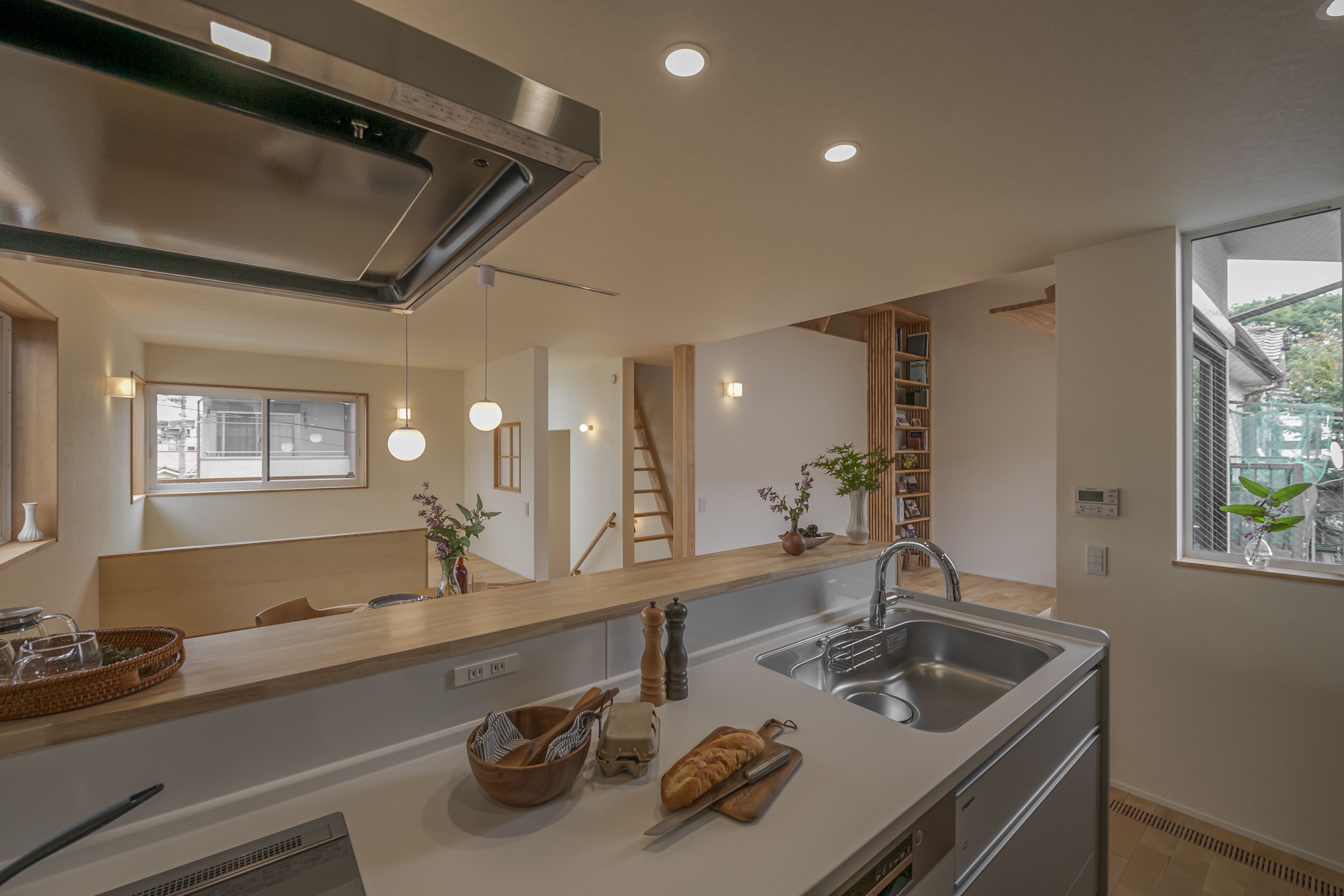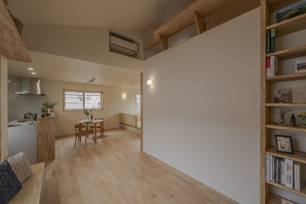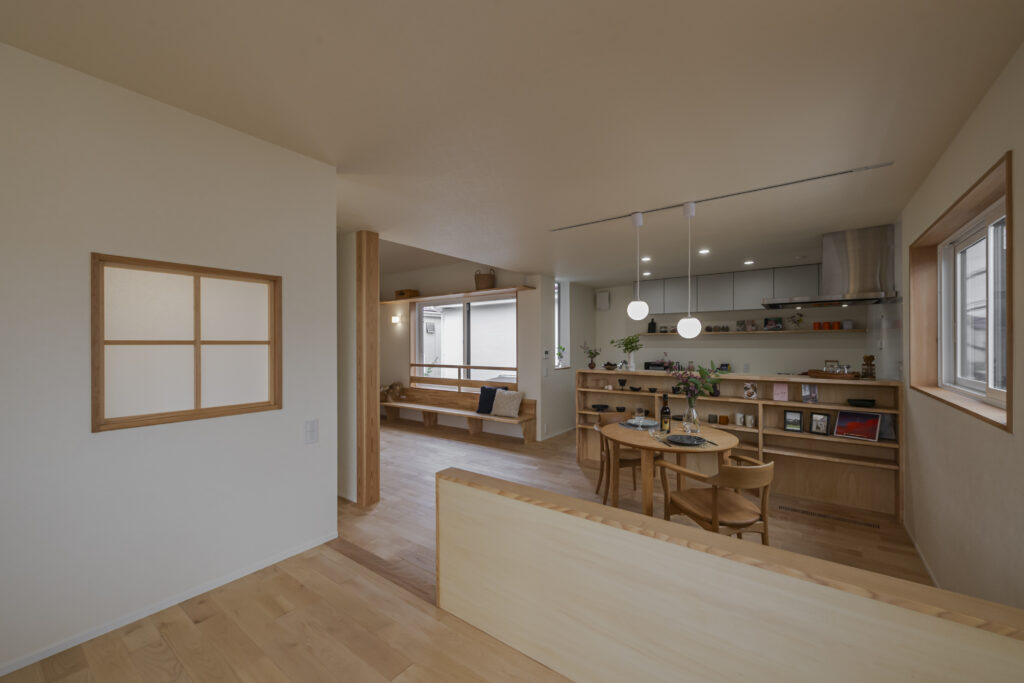 一続きのリビングダイニングには小上がり、大きな窓辺に面した広いベンチなど、オープンな空間のそこかしこに家族の居場所の生まれます。リビングに設えた本棚は小屋裏まで高く続き、小屋裏ではカウンターデスクを兼ねた、遊び心が感じられるデザインも見どころです。