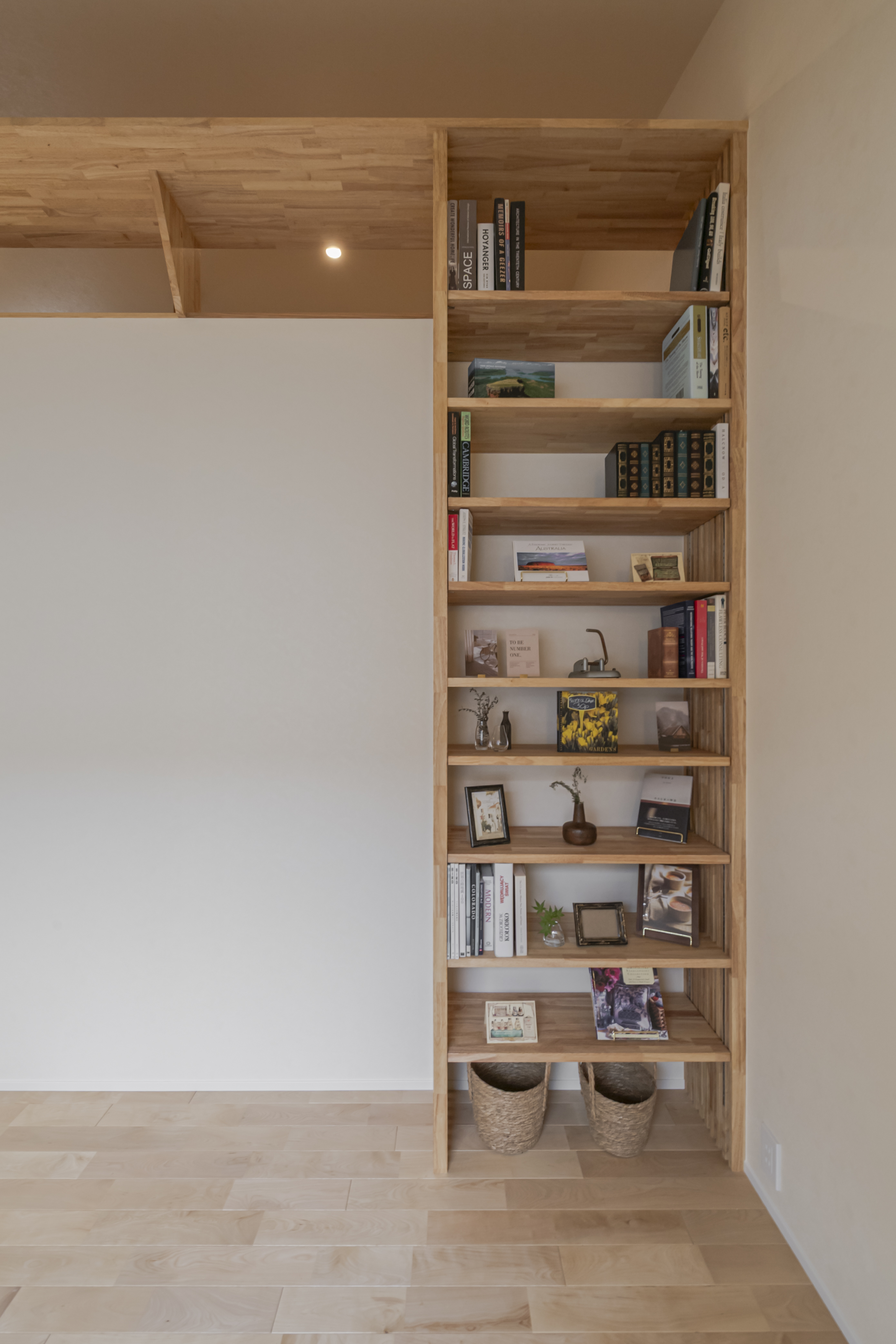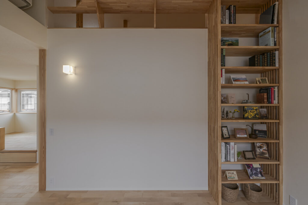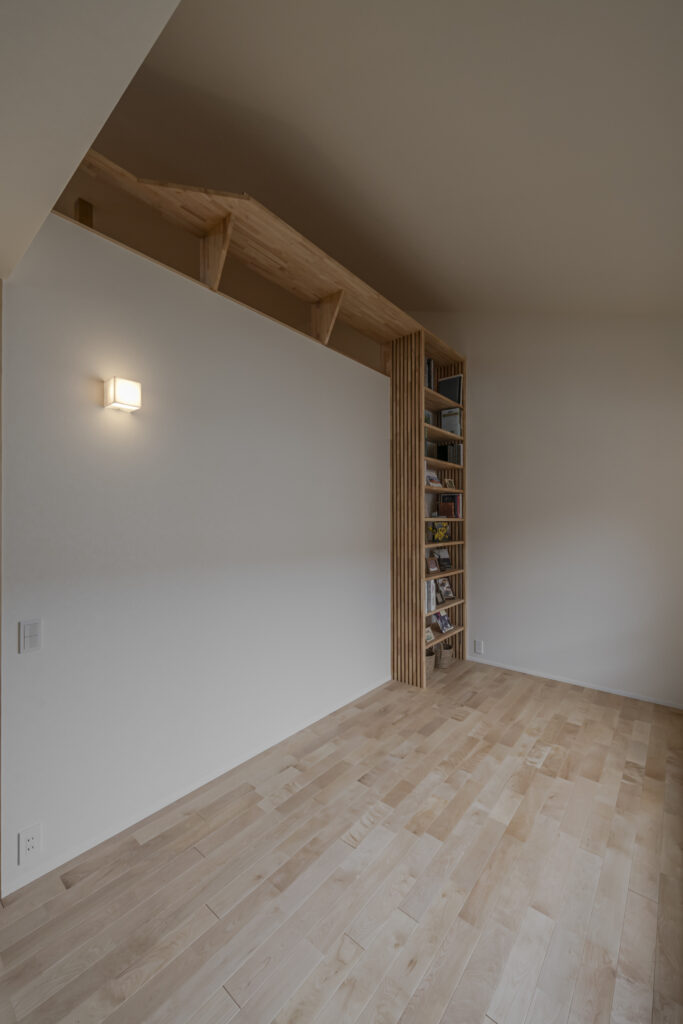 小屋裏までの背の高い本棚を造作で設えました。プロジェクターを投影する広い壁面もあり、ホームライブラリー・シアターの様に過ごせる空間です。
