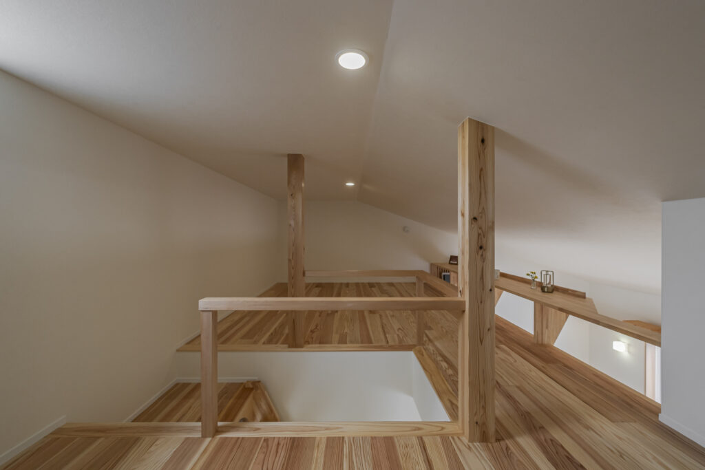 リビングの吹き抜けから続く小屋裏収納、収納スペースのため天井は低いですが、滑り出し窓からの採光があり明るさも十分です。