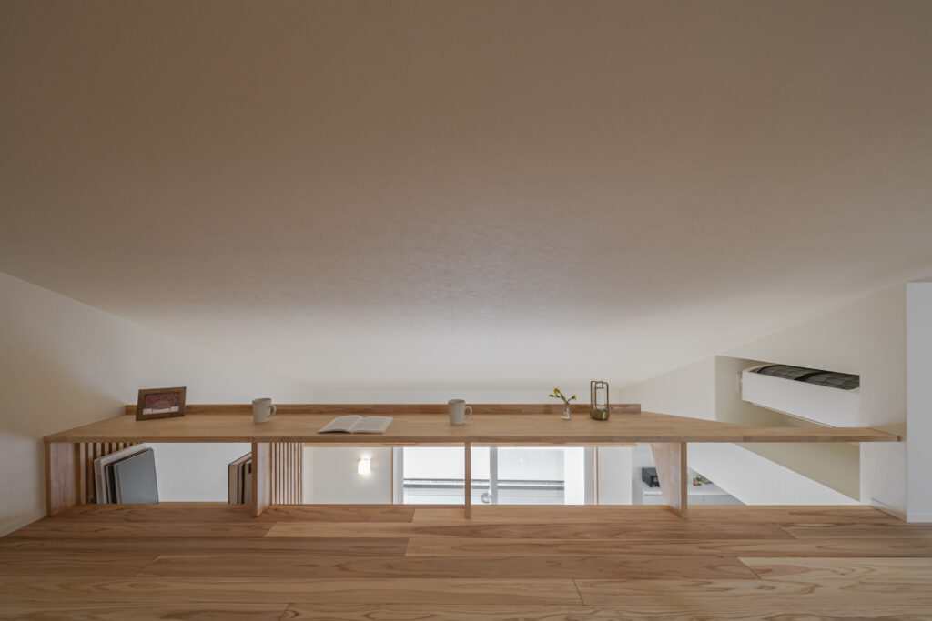 本棚の天面は横へはねだし、カウンターデスクとなっています。小屋裏に腰かけて階下のリビングで過ごす家族にも声をかけられる、遊び心のあるデザインです。