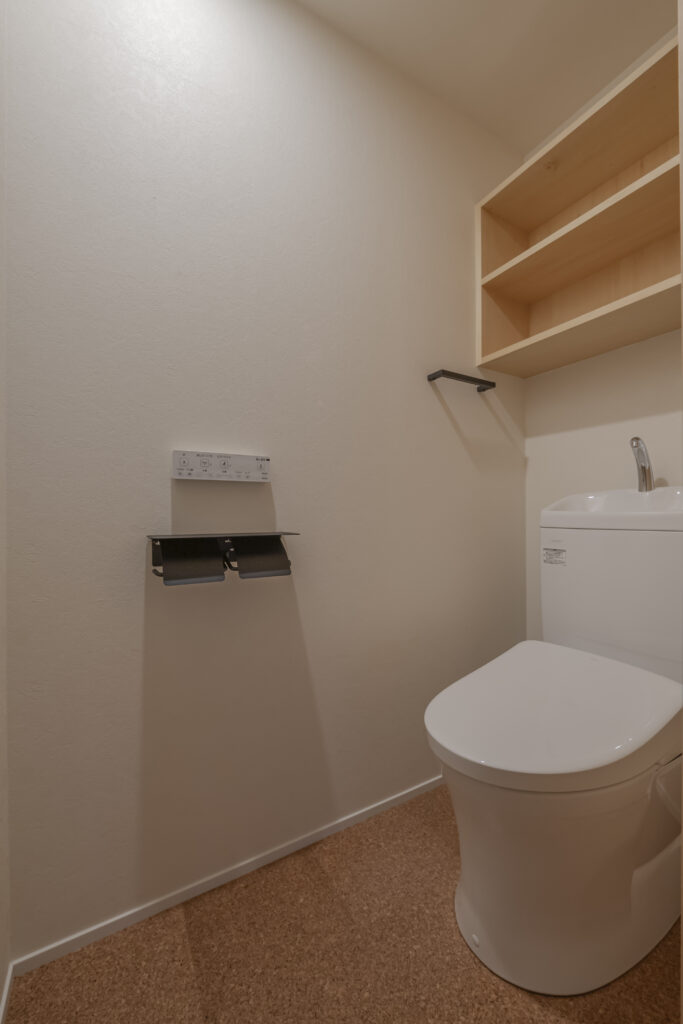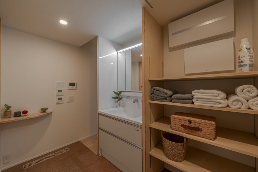 洗面室は化粧洗面台の横にオープンな棚を造作で設え。床は耐水性があり肌馴染みの良いコルクタイル貼りです。床に設けたガラリを通じて床下・小屋裏にあるエアコンからの冷暖気を取り込みます。