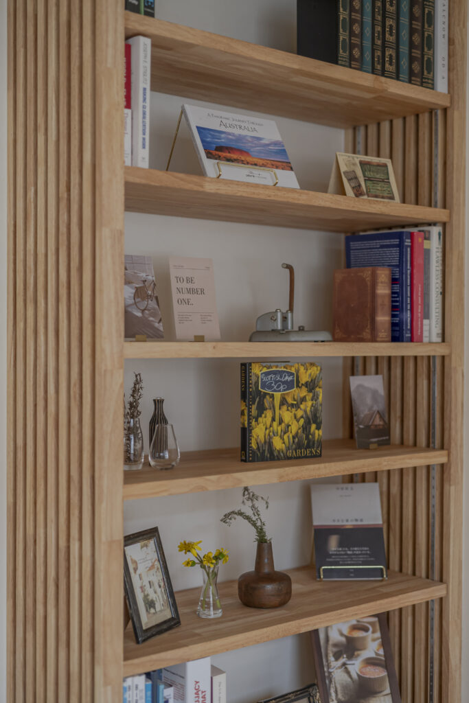 高さ約3メートルの本棚は様々な規格の本を納めることが出来るよう、固定棚と可動棚を組み合わせています。格子状の本棚は大工さんの手仕事の技が光ります。