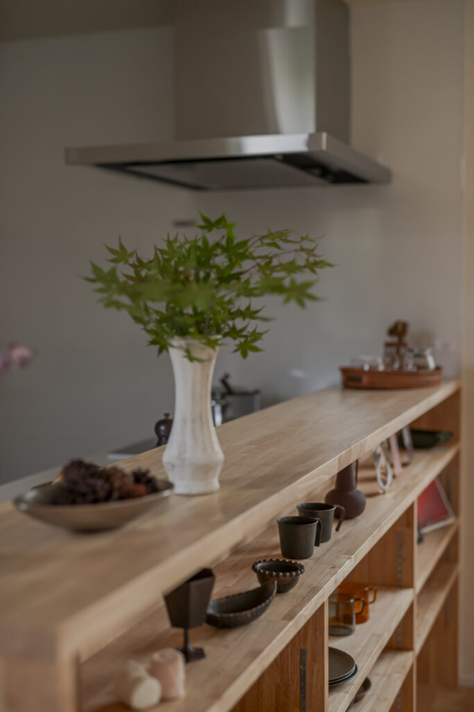 キッチンと同じ幅で設えた幅広の造作のオープン棚も、暮らしの愉しみの一つです。