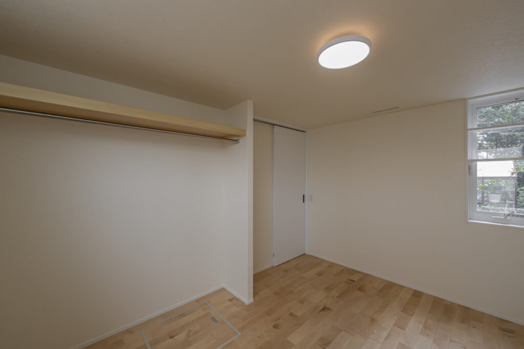 納戸には幅3mのハンガーパイプを取り付け、ファミリークローゼットとして。小窓、床・天井の「ガラリ」も設け、採光や通気も確保されています。
