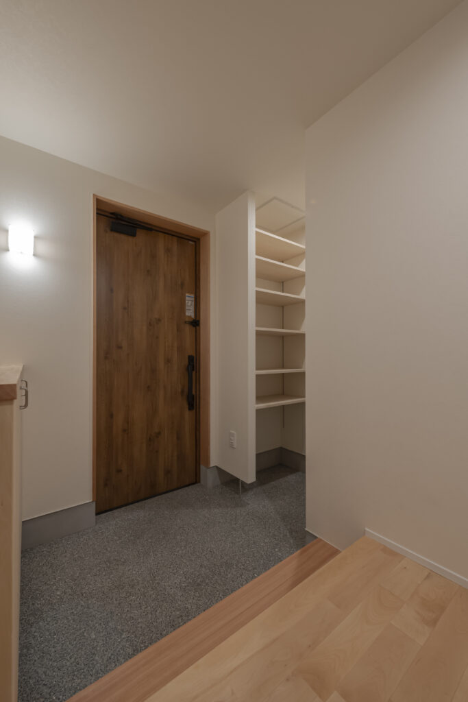 玄関脇のシューズインクローゼットは片面を棚板に、もう片面はアウター用のハンガーパイプを設置しています。