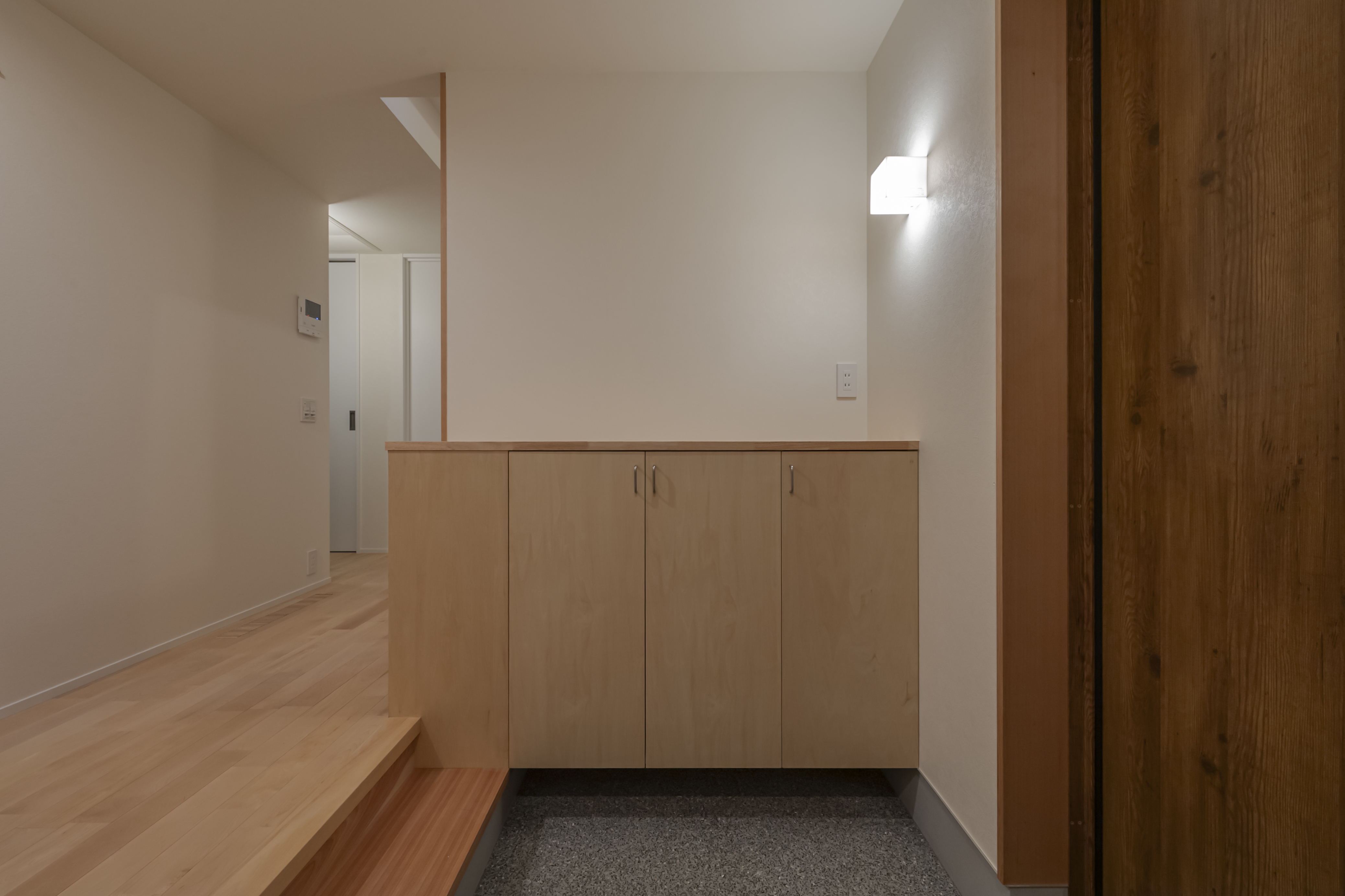 玄関にはハーフサイズのシューズボックスを造作で設え。カバザクラのフローリング材に合わせた色調で明るい玄関ホールです。