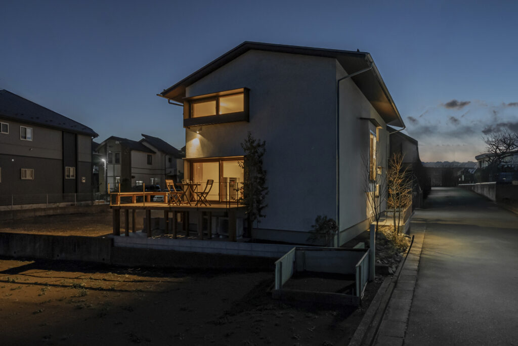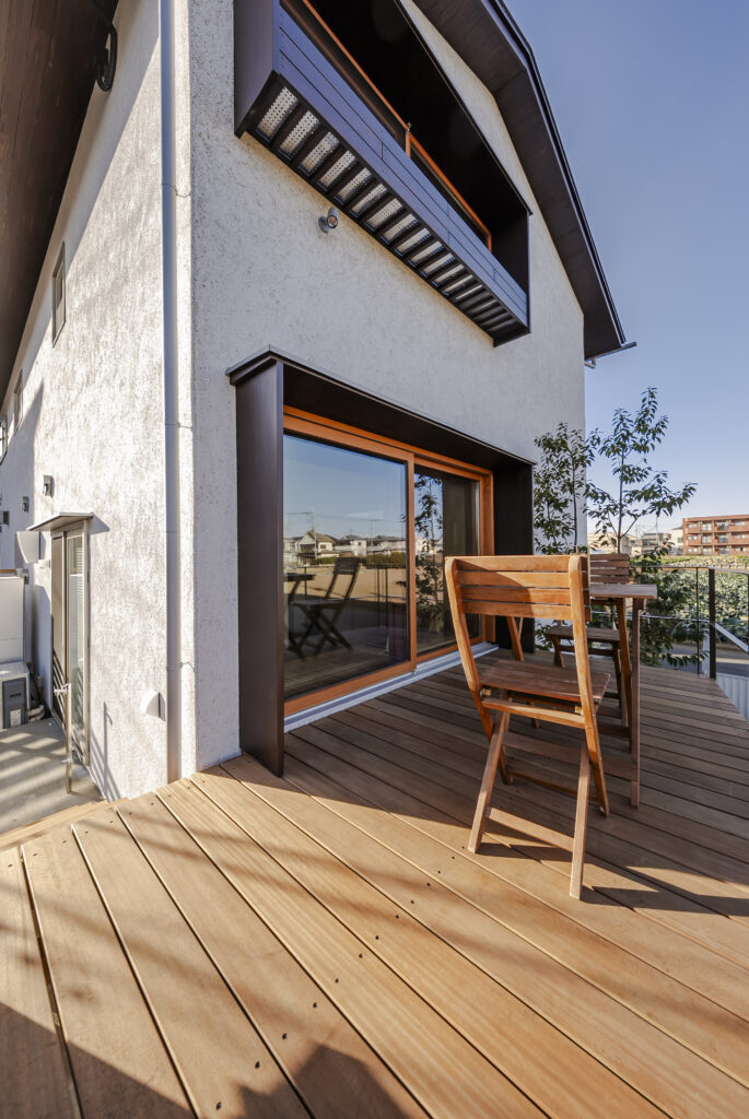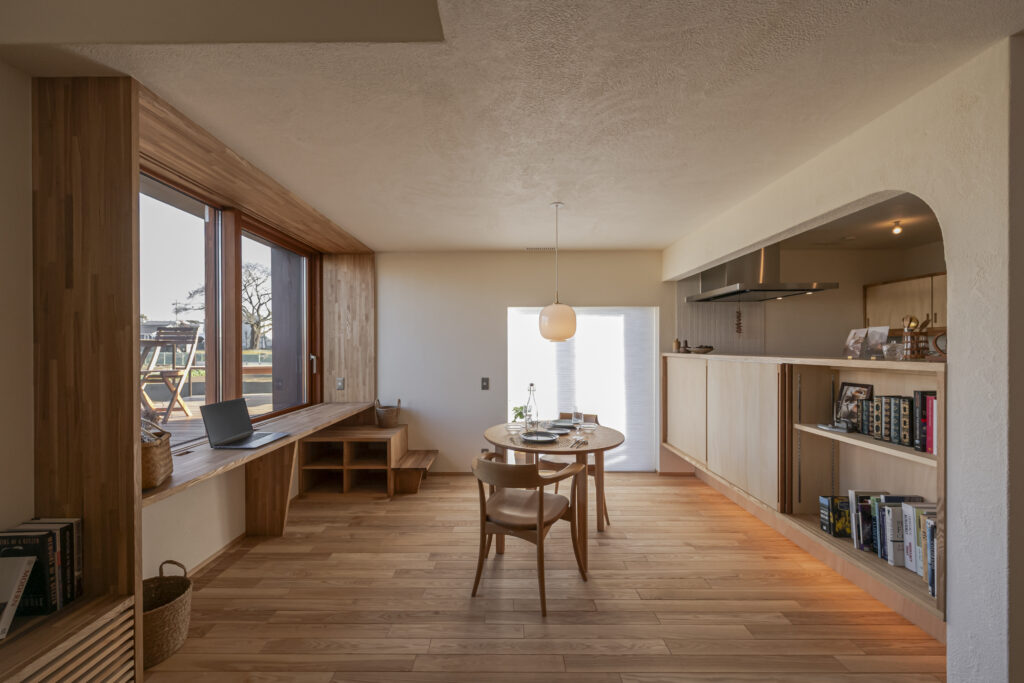 ダイニングの大きな窓はステップを上がり、外の縁台へ。内と外がゆるやかにつながり、日常に心地よい抜け感をもたらします。