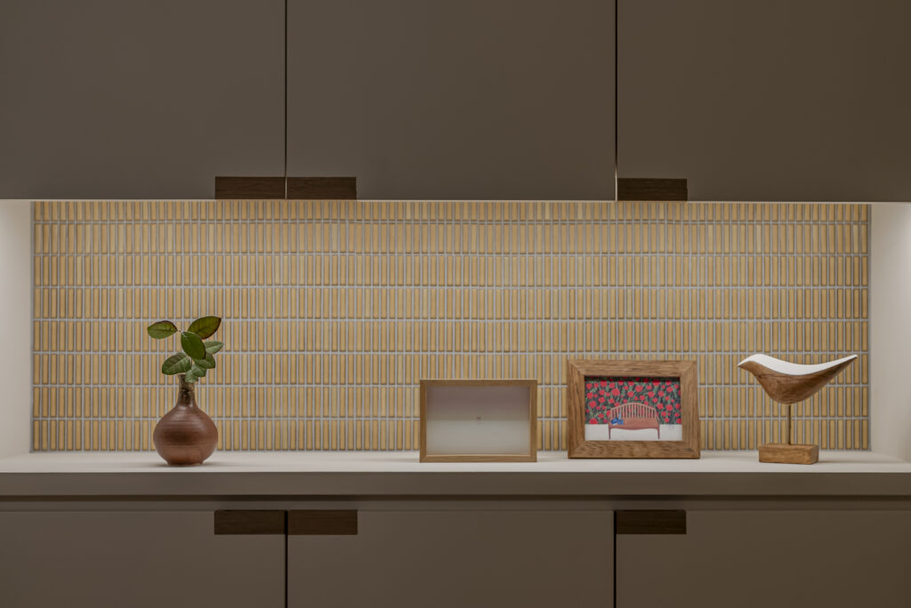 腰壁とレンジフードの側面には極細のモザイクタイル張りにして機能的に。ワークトップの前の壁にはニッチが設けられ、機能的でありながら遊び心が感じられる設計です。