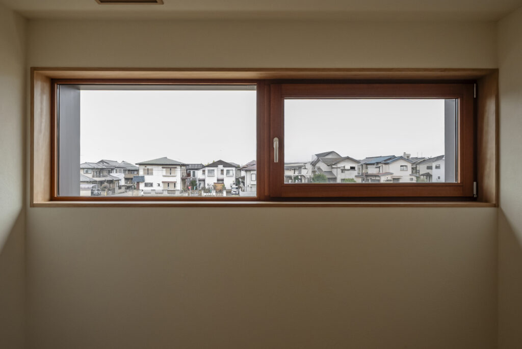 視界の開けている東側の開口部に内開きの木製サッシを採用。窓の外側には花台も設置されています。