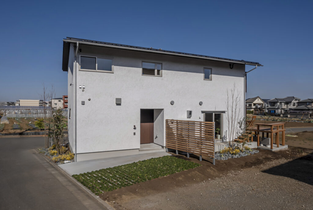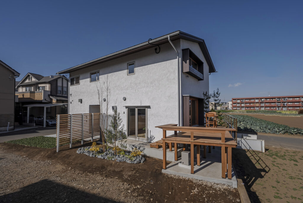 外壁は白洲そとん壁で仕上げ。淡いきなり色の壁に濃茶の窓枠がアクセントになっています。お庭での主役となる縁台も大工さんの手作りです。