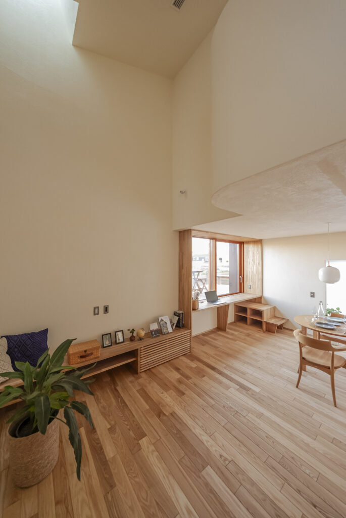 リビングには吹き抜け、ダイニングには大きな窓のある開放的な一階のリビングダイニング。吹き抜けに面した二階の廊下、キッチンの壁が曲線を描き、漆喰仕上げの空間をより柔らかな印象にしてくれます。