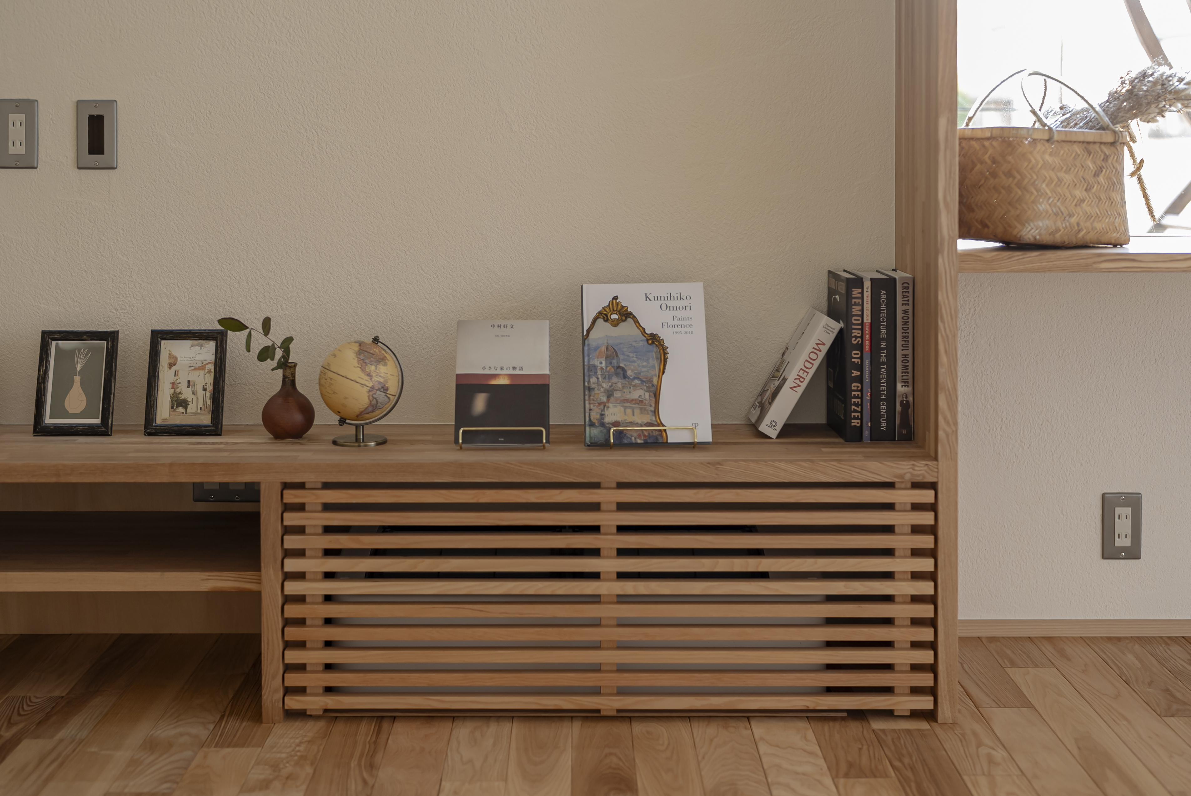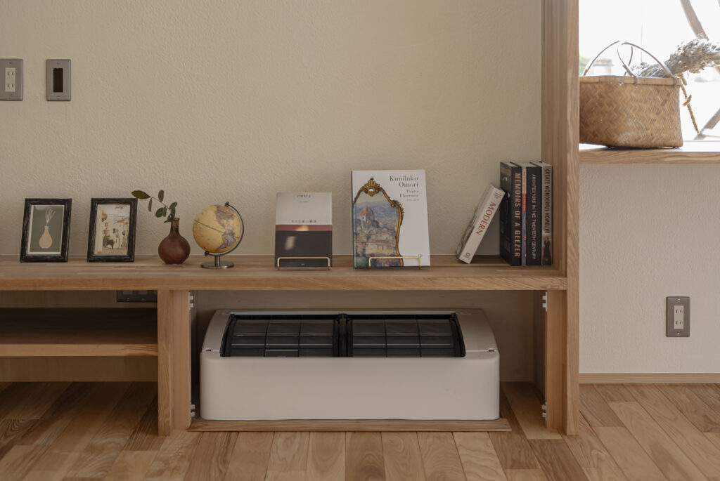 テレビボードの一部に収めたエアコン。こちらからお家全体に暖気を送り届けます。