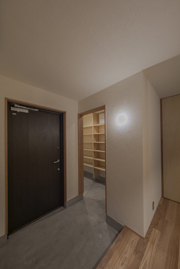 玄関脇のシューズインクローゼットは土足で入れる仕様に。天井までの可動棚で収納力もたっぷり。