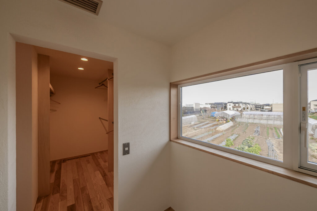 書斎からクローゼット方向を望む。書斎にも壁と同じ幅の窓が設けられ、デスクワークの合間にもほっと一息つける空間です。