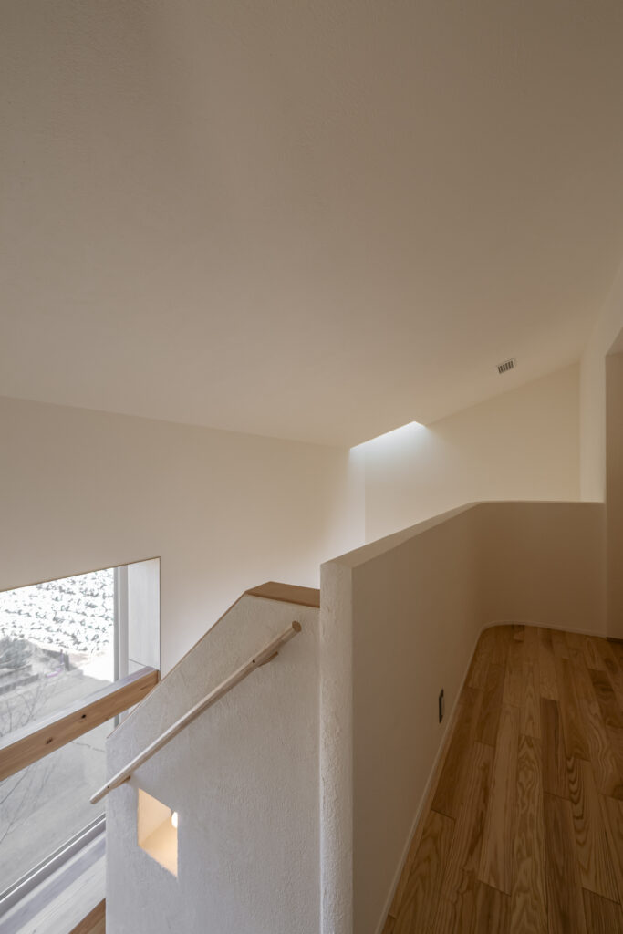 リビングから見上げた時に壁が曲線を描いていた、二階の廊下です。壁の上面もふんわりとアーチを描いたデザインで、随所にまで設計士のこだわりが感じられる意匠です。