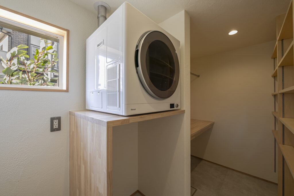 浴室前の洗濯・脱衣はクローゼットも兼ねたゆとりのある広さです。洗濯機の上には、多くのお施主様が選ばれているガス乾燥機を据え付け。