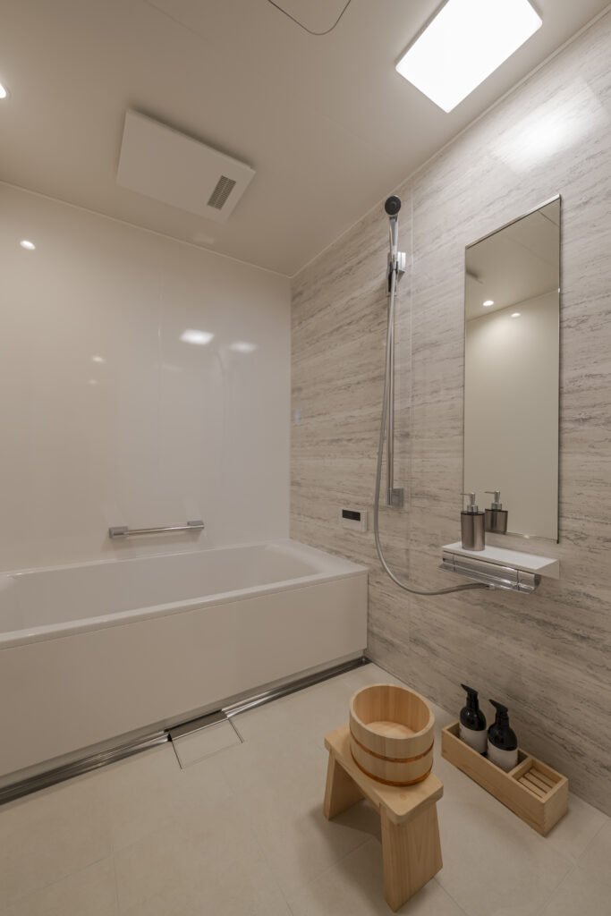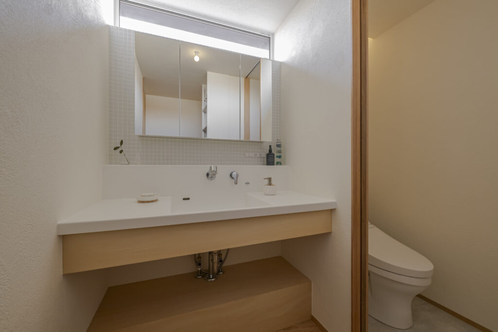 洗面台はお手入れの手軽なハイバックのシンク一体型カウンターに、ミラーキャビネットを組み合わせ。鏡側の壁には艶のあるクリアホワイトのモザイクタイルを貼り、清潔感の際立つ空間に。