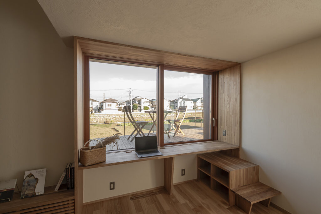 ダイニングから縁台へと続く大きな窓が外の風景を美しく切り取ります。窓枠は奥行き約50cm、椅子を並べてスタディデスクとしても活躍します。