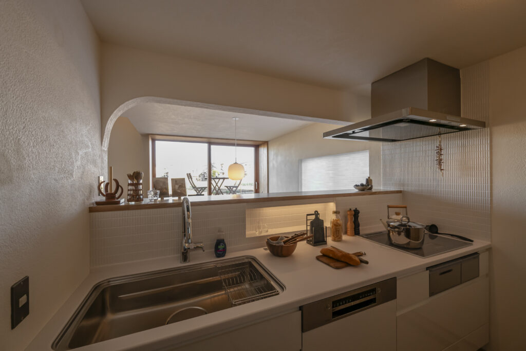キッチンカウンターの背面に設けられた造作収納は、床から浮いた様な軽やかなデザインです。曲線の垂れ壁がキッチンとダイニングを優しく仕切ります。