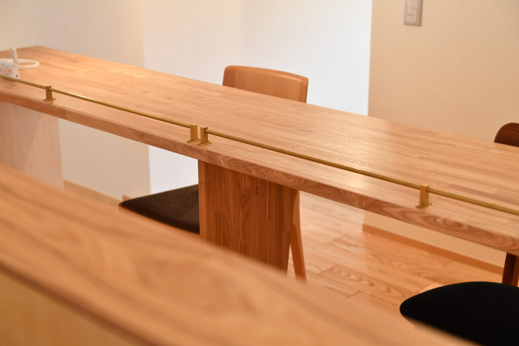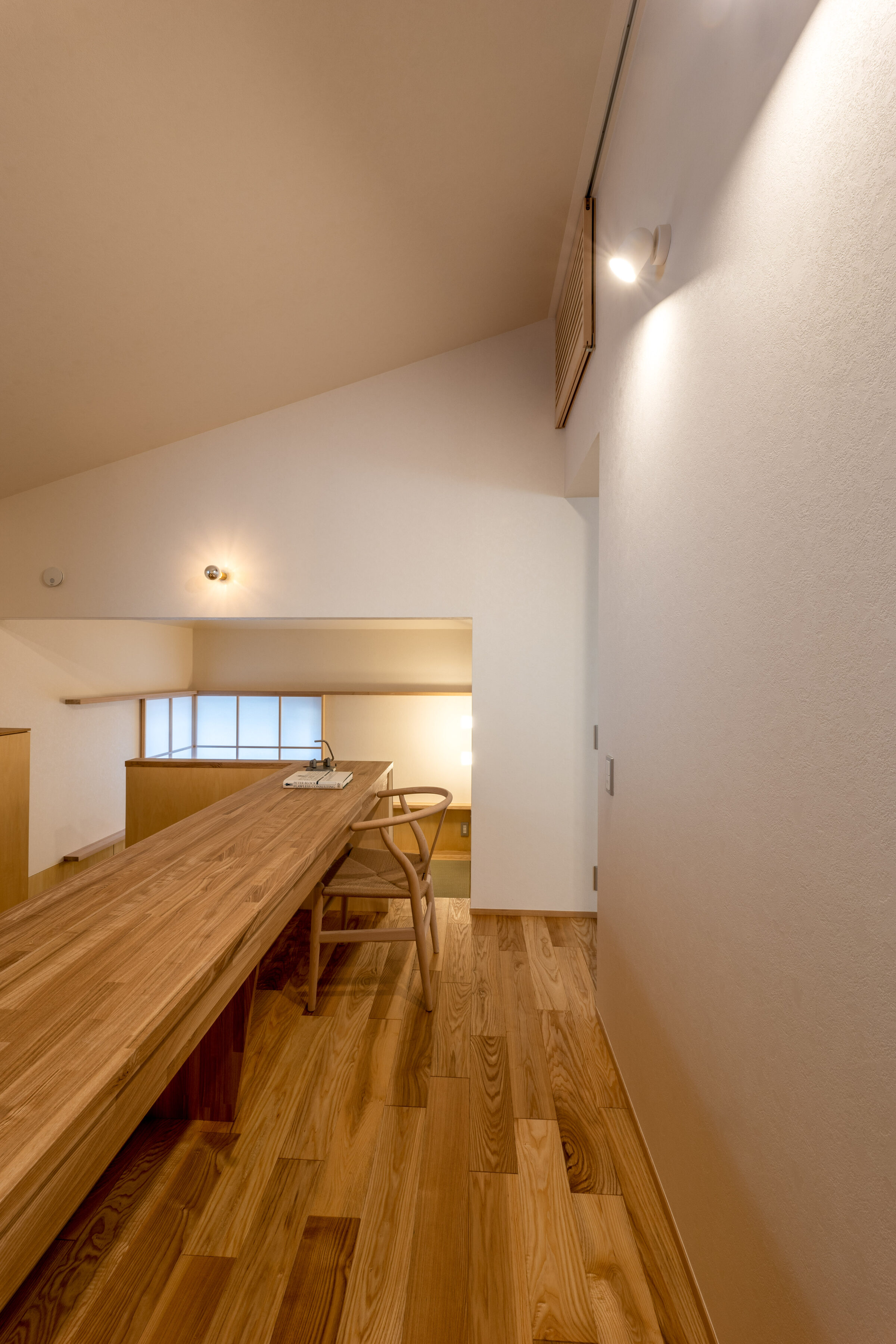 • カウンターデスクは背板のない軽やかなデザインで、上部のエアコンの冷気を階下に送るための工夫でもあります。階段の吹き抜け方向へ向いており、一階で過ごす家族の気配を感じられます。