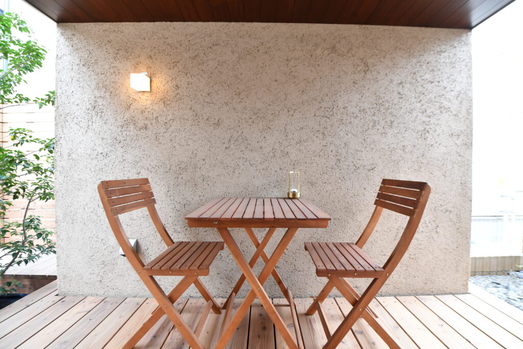 • 二階のせり出た下の部分に位置するテラス。アウトドアリビングの様に過ごせる、夏でも涼しく心地の良い場所です。