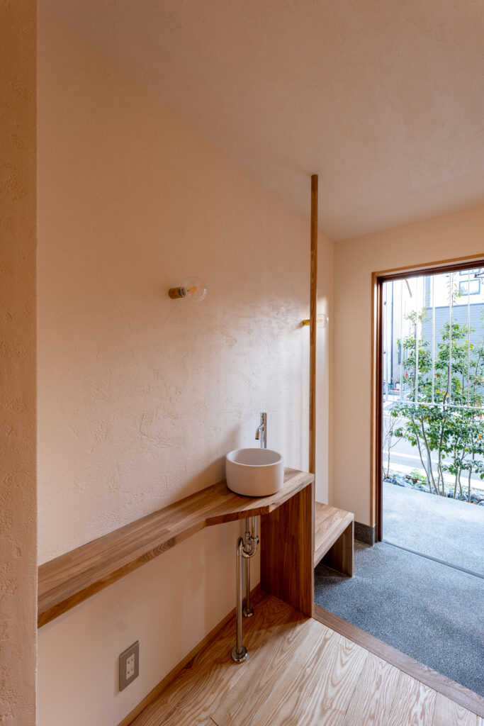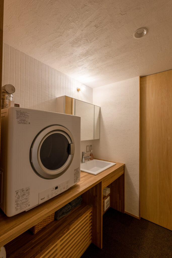 • 浴室前の洗面脱衣室。木製の造作カウンターは洗面台とガス衣類乾燥機の置台を兼ねています。
