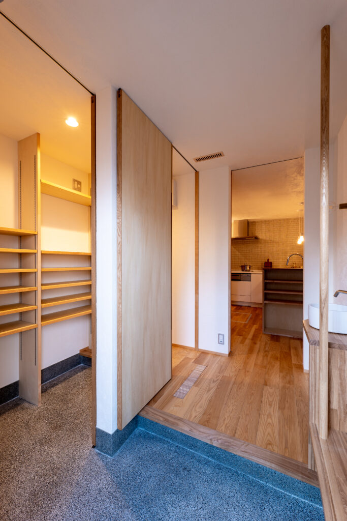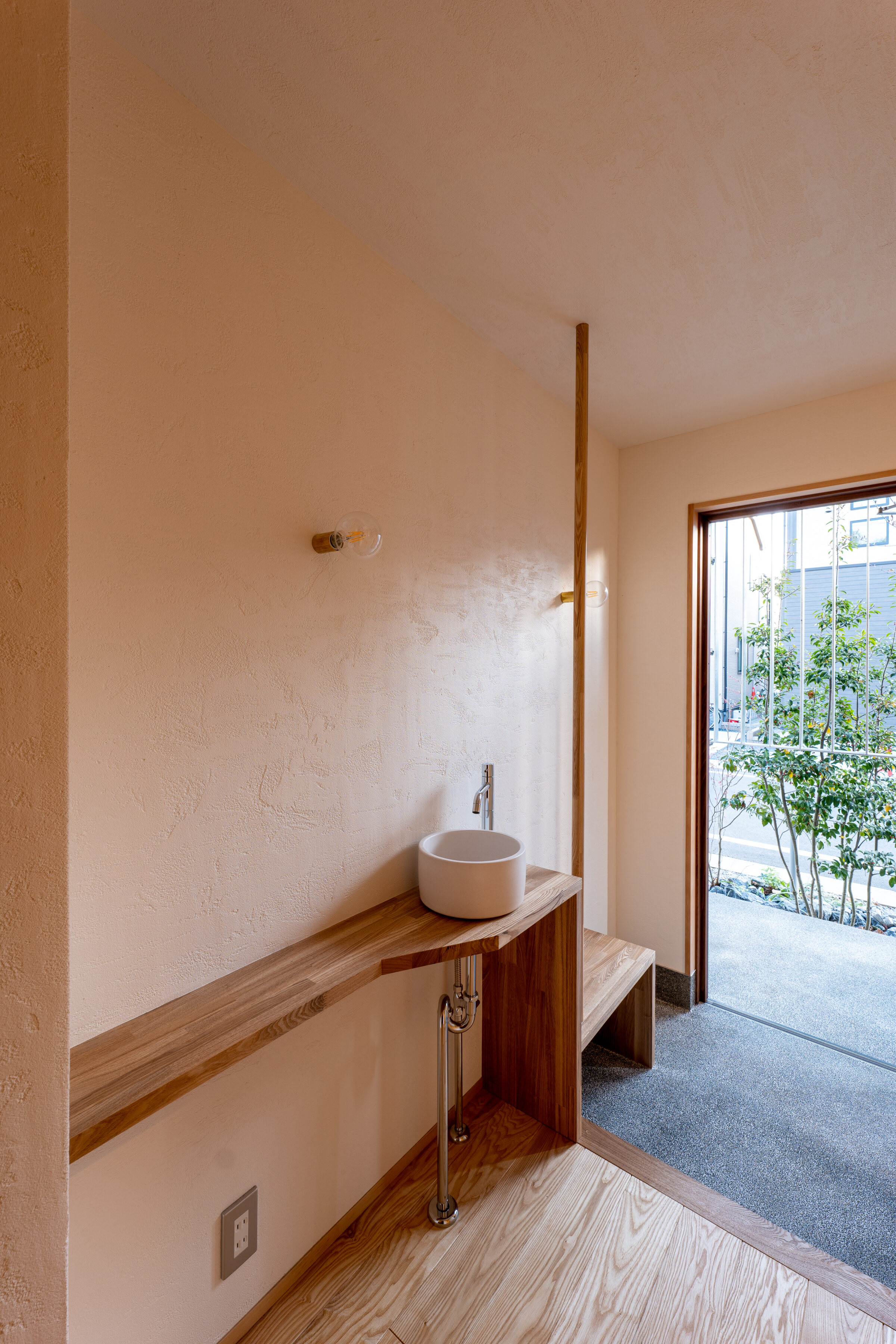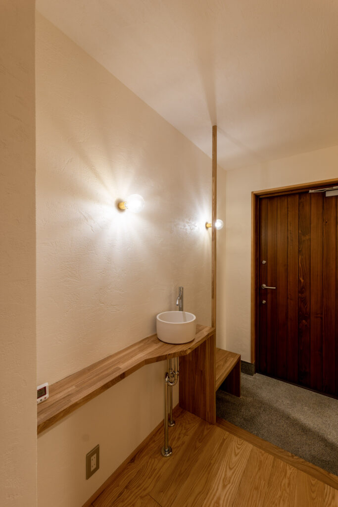 • 照明の灯りが印象的な玄関。ベンチと手洗いカウンターを設けています。