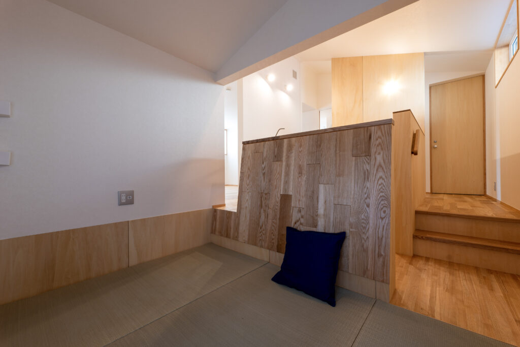 • 階段で二階へ上がる途中、一階のテラスの上に位置する畳のスペース。