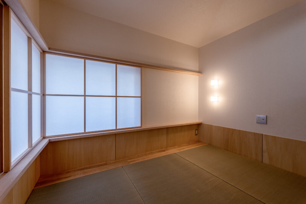 • 障子を閉じている時は柔らかな光が室内を包み、全て開けている時は光溢れる空間に。窓際のベンチはとても心地の良い空間です。