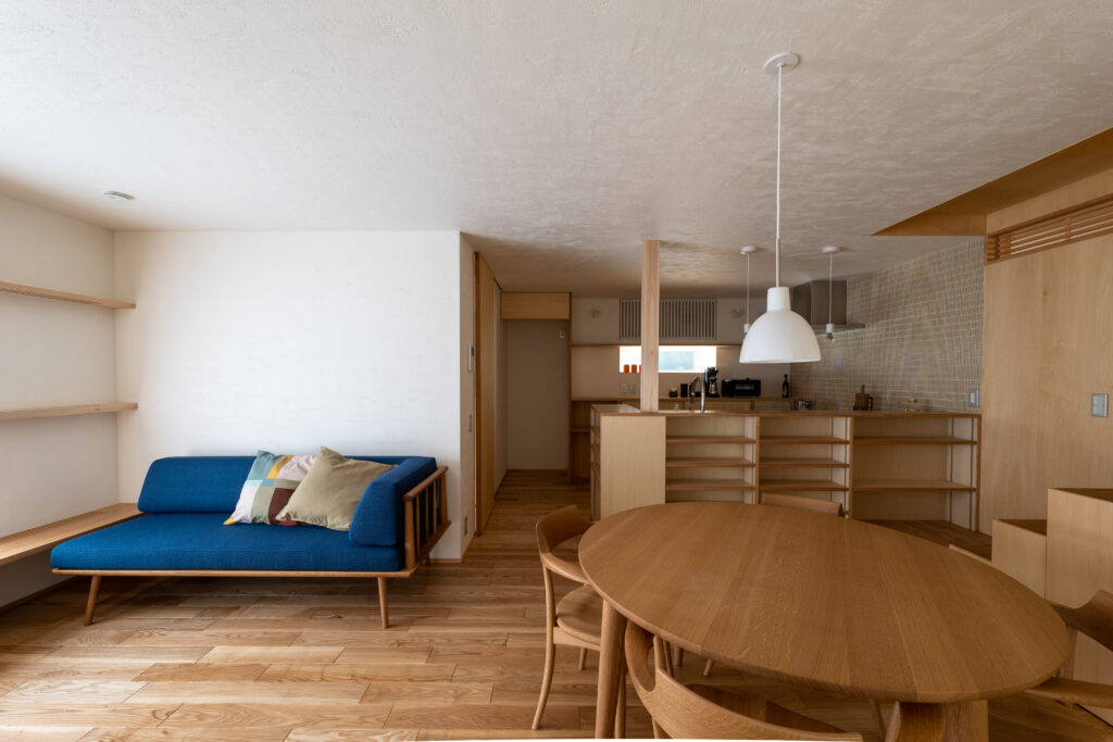 オープンな空間に籠れる空間やデスクスペースなど、心地良い居場所をそこかしこに。~LDKと用途別に空間を分けず、ひとつの空間にいろいろな用途を散りばめた構成で、コンパクトながら無駄がなく広々とした居住空間を実現しています。