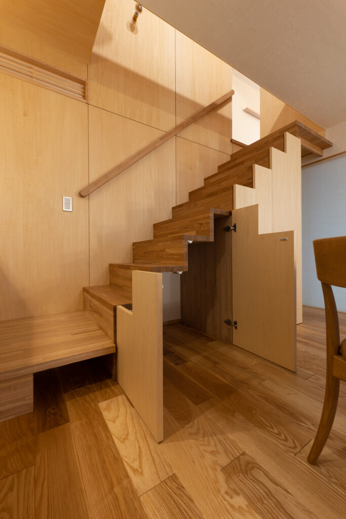 • 家具のような階段は戸を開けると、奥行きの深い収納スペースです。一段目の下にはお掃除ロボットの収納スペースも。階段側の壁面をシナベニヤで仕上げ、階段との一体感が高まります。