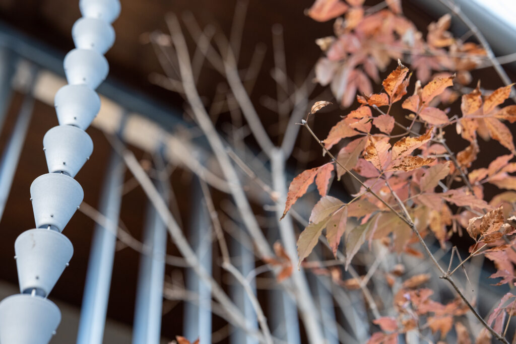 • 円錐の連なりが美しい鎖樋は、自然素材の外壁や植物とも高相性。