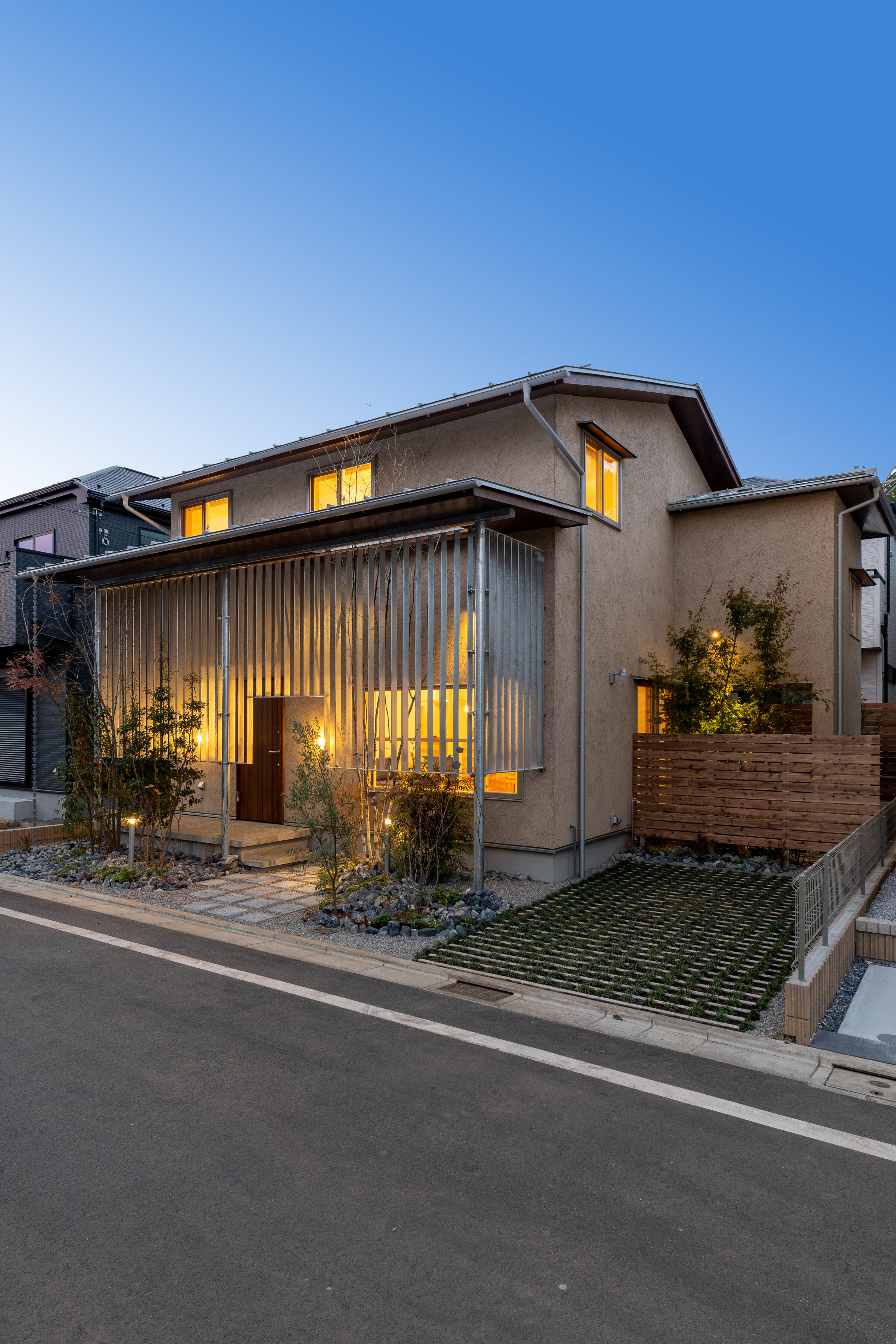 • スチールのルーバーが印象的なファサードの玄関アプローチ。外からの視線と日射を柔らかく遮りながら、敷地いっぱいに植えられた植栽が景観を作ります。